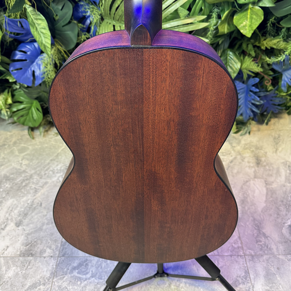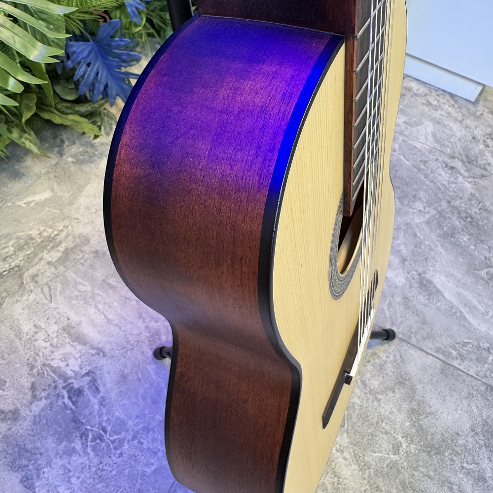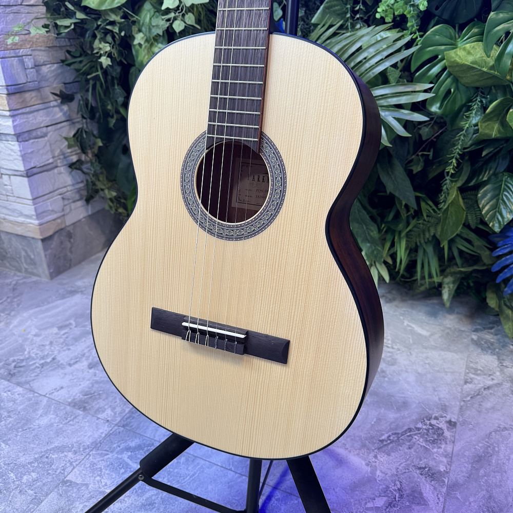 Верхняя дека изготовлена из ели, благодаря чему инструмент имеет резонансное звучание, которое действительно улучшается с годами.
