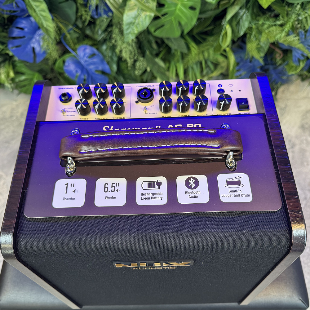 Комбоусилитель Nux AC-80 Stageman II — портативный усилитель для акустической гитары и вокала мощностью 80 Вт с перезаряжаемым аккумулятором. Двухполосная акустика (6,5" + 1"), 2 канала, эффекты, поддержка импульсных откликов (IR). Встроенный лупер, драм-машина, управление через приложение. До 4,5 часов автономной работы для выступлений на открытом воздухе.