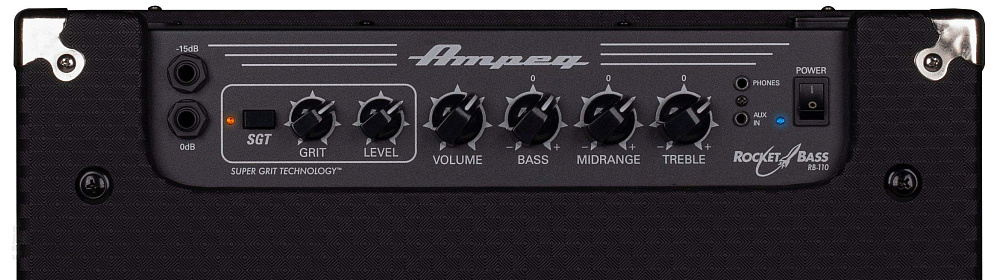 Озвучивает аудиосигнал 10-дюймовый динамик с сопротивлением 4 Ом, а встроенный усилитель обеспечивает 50 Вт максимальной выходной мощности. За формирование мощного и плотного тембра отвечает предусилитель Ampeg Legacy. Для подстройки звука есть активный 3-полосный эквалайзер, с помощью которого можно достаточно существенно изменить частотную характеристику сигнала. Овердрайв STG (Super Grit Technology) с узнаваемым «рычащим» звучанием активируется с помощью нажатия на одноименную кнопку. Для установки уровня искажений и громкости есть регуляторы Grit и Level. Наконец, для басов с пассивными и активными датчиками есть 2 входа с разной чувствительностью: 0 и -15 дБ соответственно.