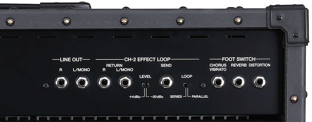 Задняя панель JC-120 наполнена возможностями подключения. Здесь есть петля эффектов для подключения монофонических или стереофонических эффектов, и вы даже можете выбрать последовательный или параллельный режим работы. Гнезда линейного выхода обеспечивают удобный монофонический или стереофонический канал для передачи звука на микшерный пульт или рекордер. Также есть поддержка опциональных футсвитчей, позволяющих легко включать/выключать эффекты хоруса/вибрато, реверберации и дисторшна усилителя во время исполнения.