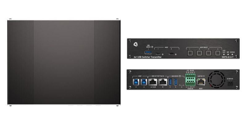 Коммутатор Kramer SWT3-41-U-T — коммутатор/передатчик USB 4x1 для периферийных устройств. 4 порта для USB-хостов (2x USB-C, 2x USB-B). Встроенный двухканальный передатчик по витой паре для удаленного подключения устройств (до 100 м). Поддержка двустороннего питания (PoC). Передача данных USB 2.0, RS-232, аудио. Управление по IP, RS-232.