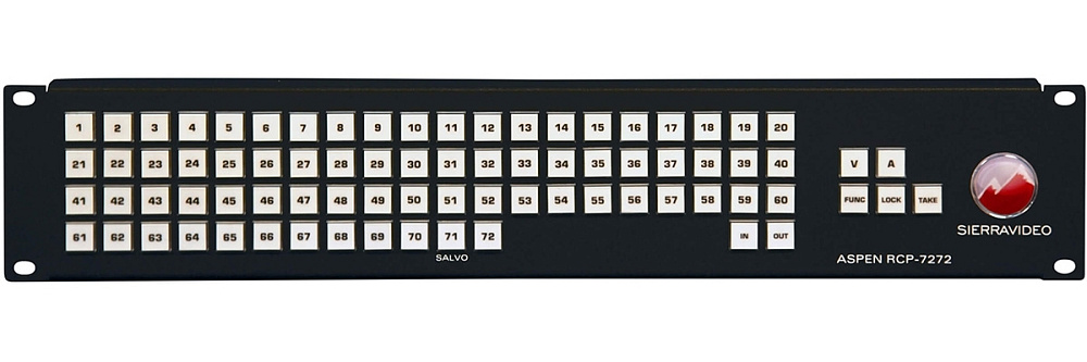 Aspen RCP-7272 — компактная панель для удаленного управления коммутаторами линейки Aspen. Панель предоставляет разнообразные возможности управления коммутаторами размерности до 72х72. Кнопки панели позволяют осуществлять коммутацию как отдельных входов и выходов, так и на вызов заранее запрограммированных состояний коммутации матрицы. Управление удаленным коммутатором и настройка панели производится через Ethernet соединение с помощью веб-интерфейса. Прибор не требует установки дополнительного программного обеспечения и драйверов.