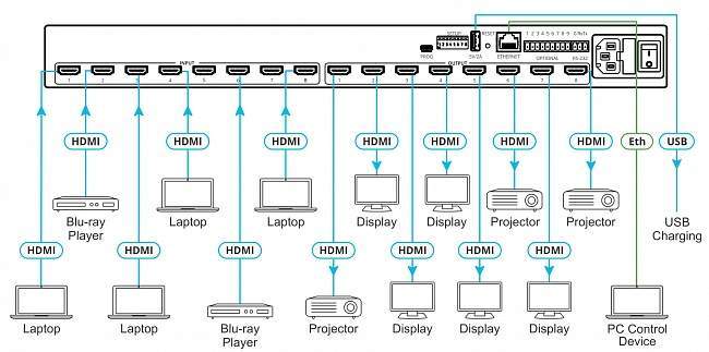 - Независимая коммутация аудио - любой эмбедированный цифровой аудиосигнал может переключаться на любой цифровой выход в дополнение к восьми источникам обратного аудиоканала (ARC), что эквивалентно аудиоматрице размерностью 16x12 (8 входов HDMI с эмбедированным аудио + 8 обратных аудиоканалов ARC на входе + 8 выходов HDMI + 4 выход ARC)