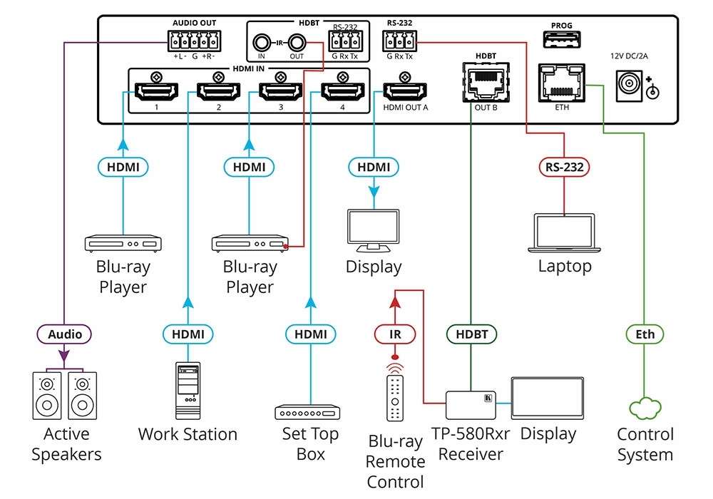 - Порты для туннелирования двунаправленных сигналов управления ИК и RS-232 в линию HDBaseT
