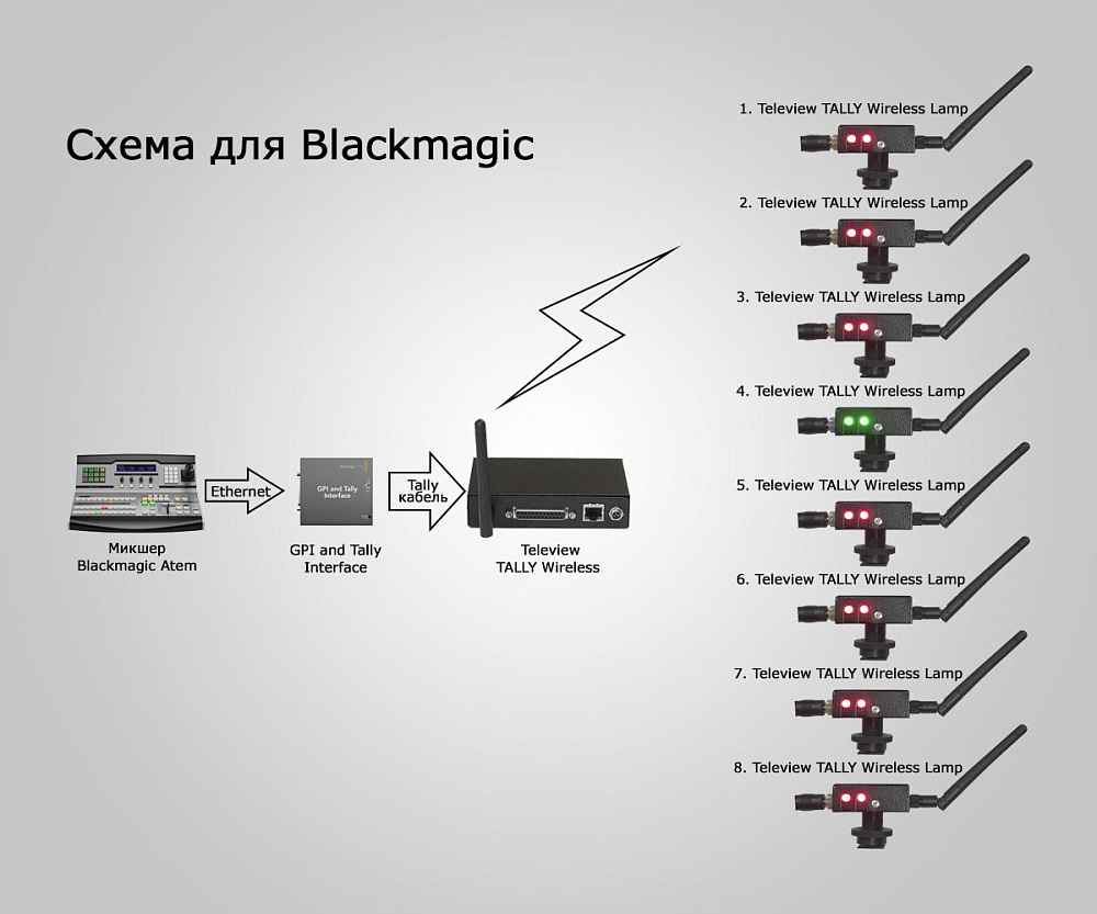 | Совместимость (передатчик – Tally Light) | Да (входит в систему Teleview TALLY Wireless) |