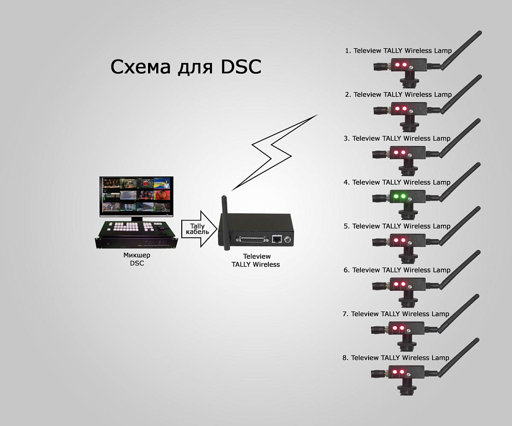 Система легко интегрируется с любым оборудованием, имеющим стандартный разъём для подключения талли-сигнала. Она полностью совместима с видеомикшерами Teleview DSC, Blackmagic Design ATEM, Datavideo, SONY, Panasonic, ROSS и другими микшерами, поддерживающими Tally-сигнал. Также работает с программными решениями, такими как vMix. Благодаря беспроводному принципу работы, она станет незаменимым помощником и для тех, кто использует PTZ-камеры на удалении от пульта управления.
