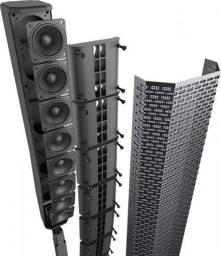 - Очень широкий угол горизонтальной дисперсии 120°, полученный благодаря специальным волноводам, и узкий угол вертикальной дисперсии 40° с асимметричной направленностью, созданный благодаря формированию линейного массива с заданными параметрами, обеспечивают максимальную концентрацию звуковой энергии на уровне сидящих и стоящих людей.