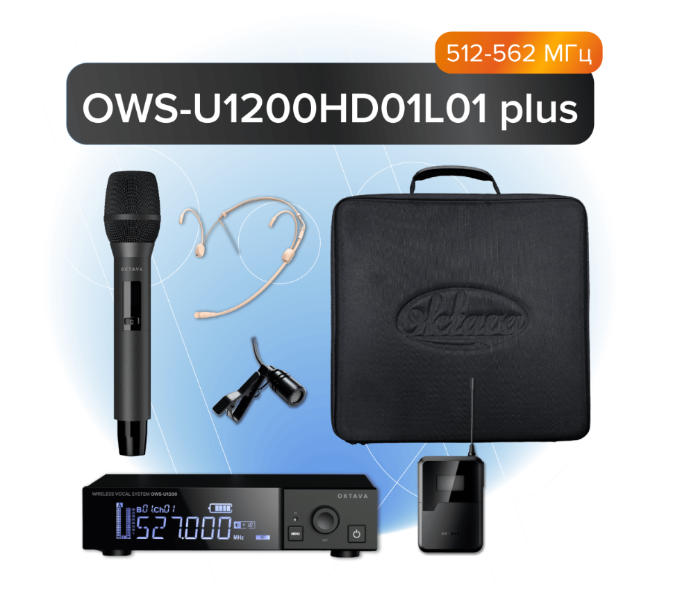 Радиосистема Октава OWS-U1200HD01L01 plus — расширенный комплект радиосистемы в кейсе. Включает ручной передатчик с микрофоном, поясной передатчик, головной и петличный микрофоны. Профессиональное решение для мероприятий любого масштаба.