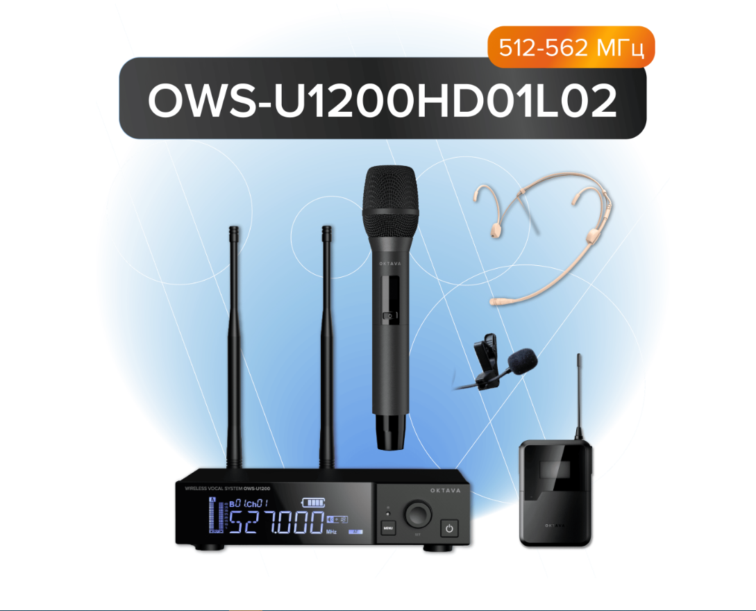 Радиосистема Октава OWS-U1200HD01L02 — одноканальная радиосистема. Комплект: ручной передатчик OWS-U1200TH, поясной передатчик, головной микрофон OWS-D01, петличный микрофон OWS-L02. Диапазон 512–562 МГц. Цифровая модуляция, автосканирование.