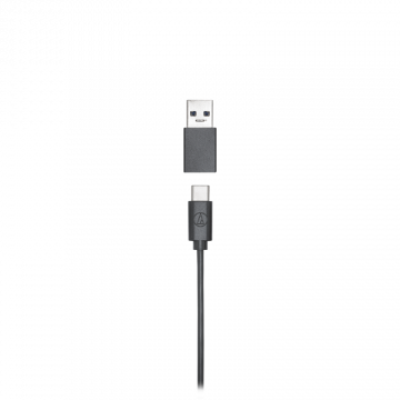 - Кабель длиной 1,8 м оснащен разъемом USB-C и поставляется с переходником USB-C на USB-A.
