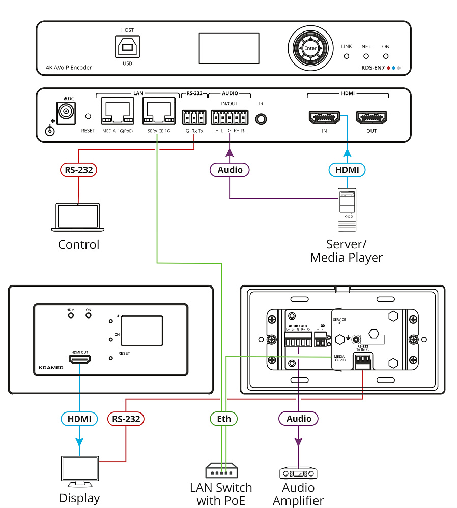 - Простое и полноценное управление по Ethernet при помощи интуитивно-понятного веб-интерфейса или команд API протокола Kramer Protocol 3000, а также вручную (выбор и индикация номера канала при помощи кнопок и ЖК-дисплея на лицевой панели)