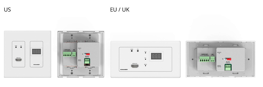 WP-DEC7 — декодер и приёмник из сети Ethernet сигналов HDMI разрешением до 4K@60 Гц (4:2:0), аудио и RS-232. WP-DEC7 производит преобразование принимаемого по IP-сети 1G цифрового потока в сигналы HDMI и RS-232, а также деэмбедирование аудио с выводом на балансный аналоговый стереовыход. Прибор выполнен в виде двухместной встраиваемой настенной панели в американском или европейском исполнении белого цвета. В качестве совместимых передатчиков/кодеров цифрового потока могут использоваться приборы KDS-EN7, KDS-SW2-EN7, KDS-SW3-EN7 и WP-SW2-EN7. Для управления устройством рекомендуется использовать контроллер KDS-7-MNGR.