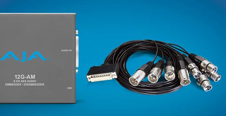 Конвертер AJA 12G-AM — 8-канальный эмбеддер/деэмбеддер аналогового звука с 12G-SDI. Поддержка видео до 4K/UHD. Breakout-кабель DB25 на 8x XLR в комплекте. Управление через ПО AJA Mini-Config.