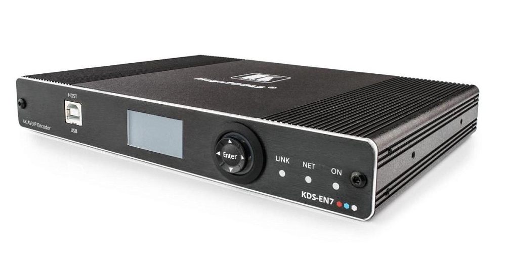KDS-SW2-EN7 — кодер и передатчик в сеть Ethernet сигналов HDMI разрешением до 4K@60 Гц (4:2:0), аудио, RS-232, ИК и USB. KDS-SW2-EN7 производит автоматическую коммутацию 2х1 сигналов HDMI и USB-C с последующим преобразованием видеосигнала, эмбедированного аудио, RS-232, ИК и USB в цифровой поток, передаваемый по сети IP на основе медной витой пары в режиме Unicast или Multicast. В качестве совместимых приёмников/декодеров цифрового потока могут использоваться приборы KDS-DEC7 и WP-DEC7. Для управления устройством рекомендуется использовать контроллер KDS-7-MNGR.