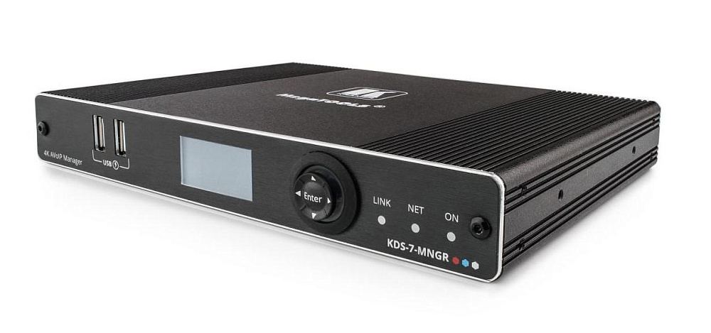 KDS-7-MNGR — контроллер для управления системами на основе устройств серии KDS-7, находящимися с ним в единой локальной сети с использованием встроенных веб-страниц. Помимо выбора канала, управления эмбедированием/деэмбедированием аудио и т.д., KDS-7-MNGR позволяет конфигурировать виртуальные матрицы, видеостены и системы KVM, построенные на основе приборов KDS-EN7, KDS-DEC7, KDS-SW2-EN7, WP-SW2-EN7, а также объединять эти приборы в группы и осуществлять их групповую работу. Настройки всех подключённых кодеров/декодеров, включая конфигурацию IP-режимов и адресов, настройки совместимости, и т.д. наглядно отображаются и легко обновляются.