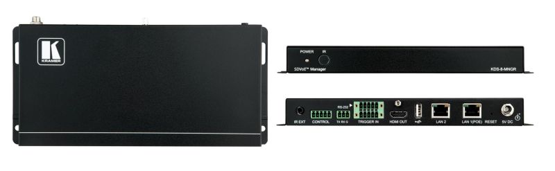 KDS-8-MNGR — контроллер для управления системами на основе устройств KDS-8 и KDS-8F, находящимися с ним в единой локальной сети, с использованием встроенных веб-страниц. Без использования данного централизованного средства управления, каждая пара кодер/декодер в сети может работать только в режиме точка-точка. Помимо обеспечения маршрутизации цифровых потоков контроллер KDS-8-MNGR позволяет конфигурировать режимы виртуальной матрицы, видеостены и мультиоконного процессора включённых в общую сеть устройств KDS-8 и KDS-8F. Все настройки подключённых передатчиков и приёмников, включая конфигурирование IP-адресов, объединение устройств в группы, добавление и удаление устройств, создание макрокоманд, настройку работы с EDID, настройку работы по расписанию, обновление встроенного ПО и т.д., наглядно отображаются и легко осуществляются при помощи интуитивно-понятных встроенных веб-страниц.