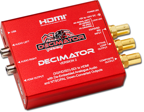 Конвертер Decimator 2 — конвертер 3G/HD/SD-SDI в HDMI с деэмбеддером аналогового звука. Автоопределение 26 форматов. Одновременный вывод HDMI и композитного сигнала. Аудиометры, оверлеи безопасных зон. Низкая задержка.