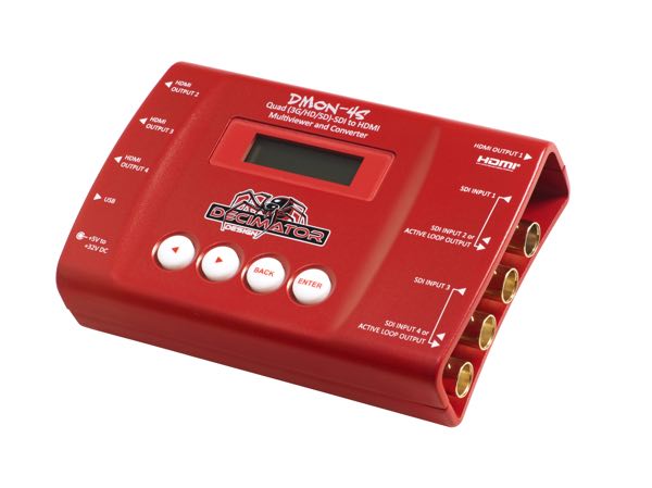 Мультививер Decimator DMON-4S — 4-канальный мультивьювер с 4 независимыми HDMI выходами. Преобразование 4x SDI в HDMI или мультипросмотр. 8-канальные аудиометры на окно. Горизонтальный/вертикальный поворот. Гибкое распределение видеопотоков.