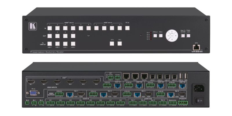 VP-554X — презентационный масштабатор-коммутатор 11x4:2 сигналов HDMI (6), VGA (1) и HDBaseT (4). Прибор осуществляет коммутацию (в ручном или автоматическом режиме) и производит повышающее или понижающее масштабирование сигналов HDMI до 4K60 (4:4:4), сигналов HDBaseT до 4K60 (4:2:0) и сигнала VGA до 1080р60 с выводом на четыре независимых сдвоенных выхода HDMI/HDBaseT. В устройстве имеются линейные входы аудио, два микрофонных входа с фантомным питанием, встроенные процессор цифровой обработки аудио, усилитель мощности 2х20 Вт, коммутатор 4x1 USB и 3-портовый коммутатор Ethernet. Имеется возможность эмбедирования/деэмбедирования аудио в/из HDMI с выводом на 4 балансных аналоговых выхода. Предусмотрена возможность туннелирования сигналов ИК, RS-232 и Ethernet в линию HDBaseT. Устройство может управляться в ручном режиме при помощи кнопок лицевой панели и экранного меню, а также удалённо при помощи RS-232 или по Ethernet и команд протокола Kramer Protocol 300, а также при помощи встроенных веб-страниц.