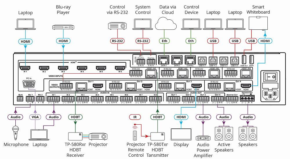 | Входы | 6 HDMI, VGA (15-конт. разъем HD D-sub), 4 HDBaseT (RJ-45), 8 балансное стерео аудио (5-конт. блок съемных клемм), 2 небалансное моно аудио (микрофон) (3-конт. блок съемных клемм) |