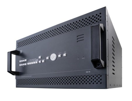 VW-16 — масштабатор, выполняющий функцию контроллера видеостены и мультиоконного процессора. Прибор имеет 4 входа и 16 выходов HDMI, обеспечивает бесподрывное переключение входов, повышающее и понижающее масштабирование сигнала в пределах разрешения 4K@60 Гц (4:4:4), поддержку видеостен любой размерности в пределах 16 дисплеев, а также различных режимов мультиоконного процессора. В устройстве имеются функции выбора эмбедированного аудио для видеостены с любого из 4-х входов, а также деэмбедирования аудио с выводом на аналоговый стереовыход. Гибкие возможности управления включают кнопки лицевой панели, экранное меню, Ethernet и встроенные веб-страницы с удобным интуитивно-понятным пользовательским интерфейсом, а также последовательные команды, передаваемые по интерфейсам RS-232, RS-485 и RS-422.