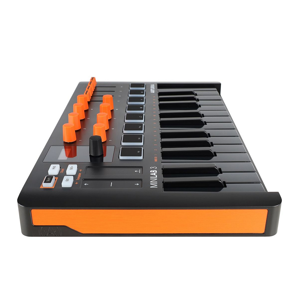 MIDI-клавиатура Arturia MiniLAB 3 Orange Edition — 25-клавишный USB MIDI-контроллер в оранжевом цвете. 8 энкодеров, 8 RGB-пэдов, 8 фейдеров. Дисплей, сенсорные регуляторы Pitch/Modulation. Режим аккордов, арпеджиатор. Комплект ПО «все-в-одном». Яркий акцент для творческого пространства.