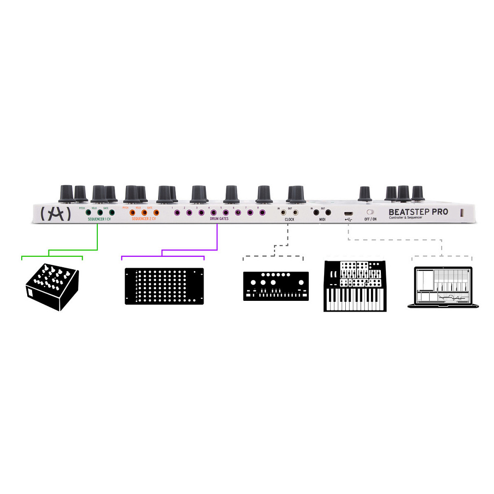 К BeatStep Pro можно подключить практически любое музыкальное устройство: компьютеры, виртуальные инструменты, синтезаторные модули, драм-машины, а также ко всем устройствам имеющими USB, MIDI, CV/Gate, Clock или DIN входы/выходы. От устаревших музыкальных технологий до самых современных, BeatStep Pro непременно станет центром вашей установки и сердцем вашего творчества на долгие долгие годы.