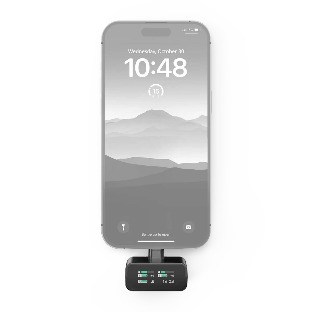 Приёмник оснащён цветным OLED-дисплеем с гироскопом, который автоматически переворачивает изображение при изменении ориентации — вы всегда видите уровень сигнала, заряд батареи и статус записи. На корпусе приёмника расположен выход на наушники (3.5 мм) для прямого бесшумного мониторинга (zero-latency monitoring), что позволяет сразу слышать, как звучит запись. Для подключения к камере, смартфону или компьютеру используются комплектные кабели и адаптеры: USB-C – USB-C, USB-C – USB-A, USB-C – Lightning, а также TRS – TRS для камер.