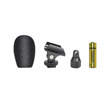 - В комплект также входит крепление на башмак для камеры, сменное основание для микрофонной стойки, поролоновый ветрозащитный экран, два монофонических адаптера