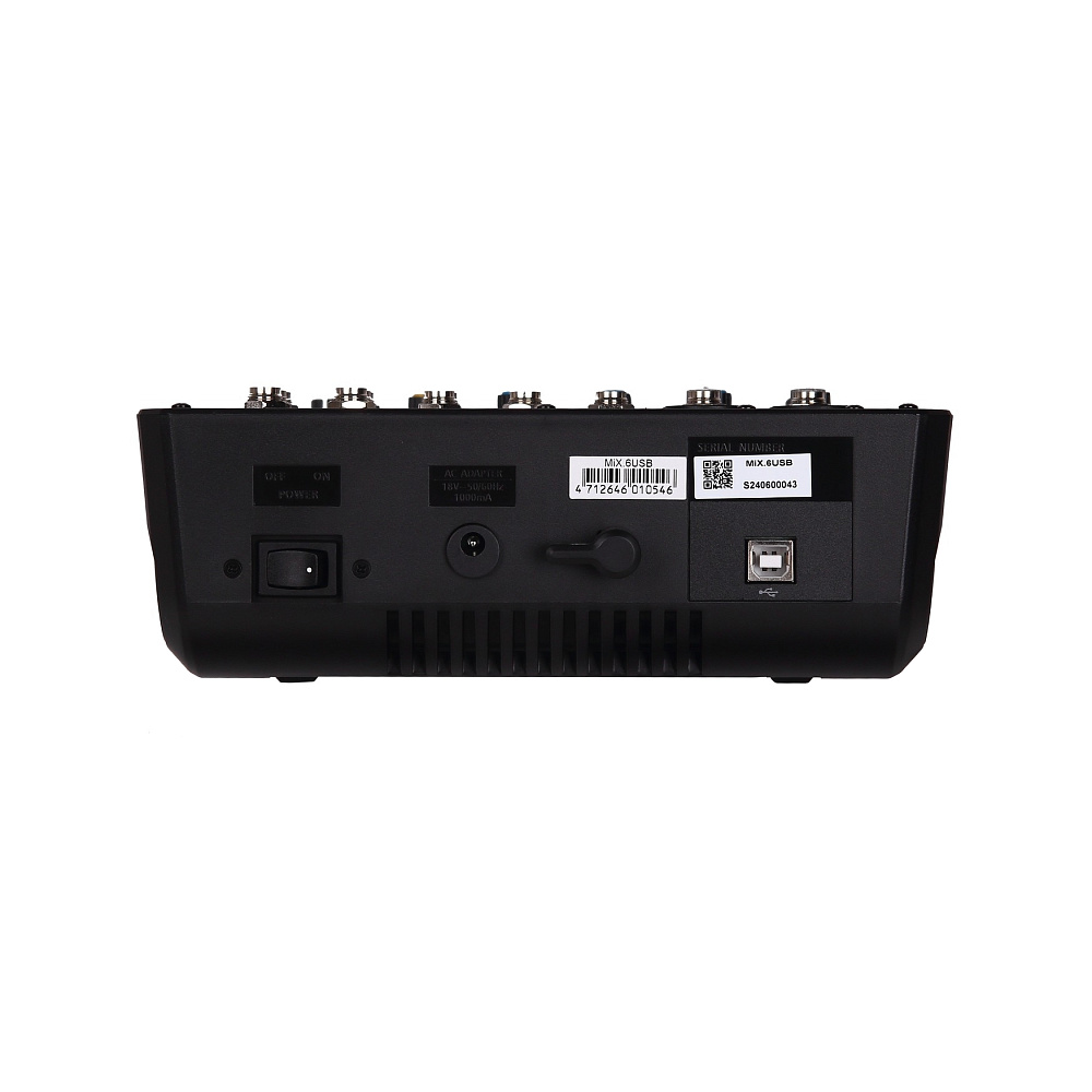 Ключевая особенность MiX .6USB — встроенный USB аудиоинтерфейс 2×2 на разъёме USB Type-B. При подключении к компьютеру пульт превращается в полноценную звуковую карту, поддерживающую 16-битную разрядность и частоту дискретизации 44.1 кГц. Это позволяет записывать финальный стереомикс непосредственно в DAW, а также воспроизводить звук с компьютера через каналы 2-Track или основную шину. Совместимость с операционными системами Windows (XP и выше) и macOS (9.0.4 и выше) делает MiX .6USB универсальным инструментом для стриминга, подкастов и создания демо-материала.
