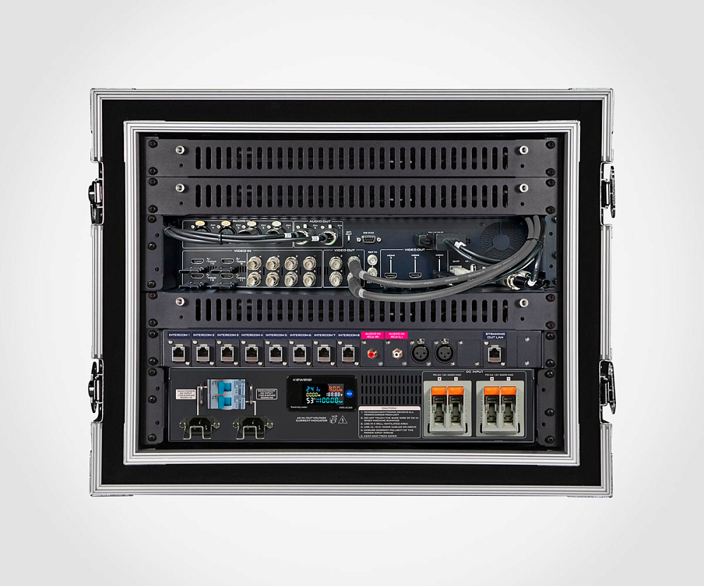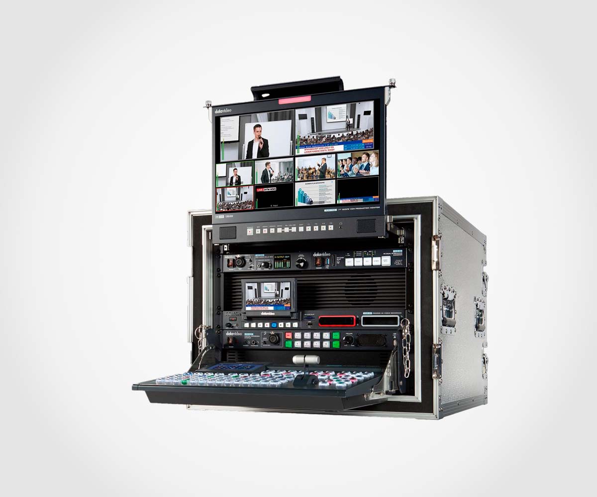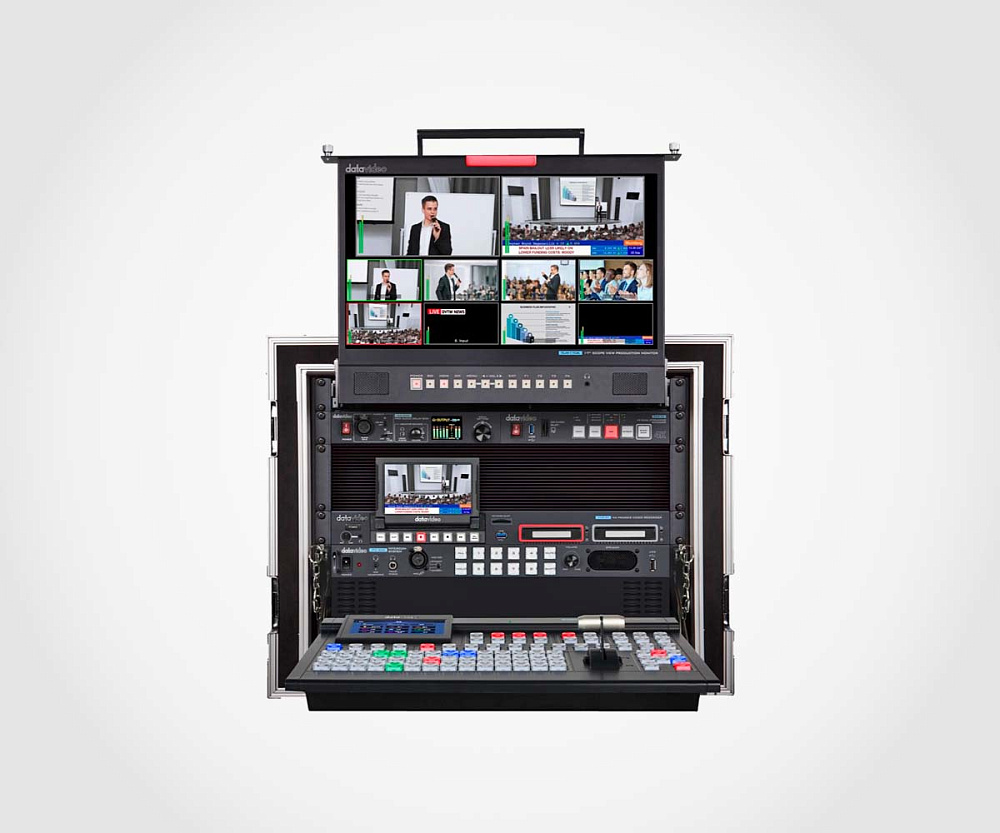 Datavideo MS‑4000 – это готовая к работе мобильная студия уровня «вещание», заключённая в ударопрочный 8U флайт-кейс. В отличие от сборных систем, где компоненты подбираются и подключаются отдельно, MS‑4000 объединяет в одном корпусе четырёхканальную 4K‑студию и поставляется в полной комплектации «под ключ». Система включает в себя микшер SE‑4000, 17,3‑дюймовый 4K‑монитор TLM‑170KM, ProRes‑рекордер HDR‑90, 8‑канальную интерком‑систему ITC‑300, аудиопроцессор AD‑300, сетевой стриминговый энкодер NVS‑36 и систему резервного питания PD‑2A/PD‑4A. Достаточно открыть крышку кейса, подключить камеры и электропитание – и студия готова к работе** .