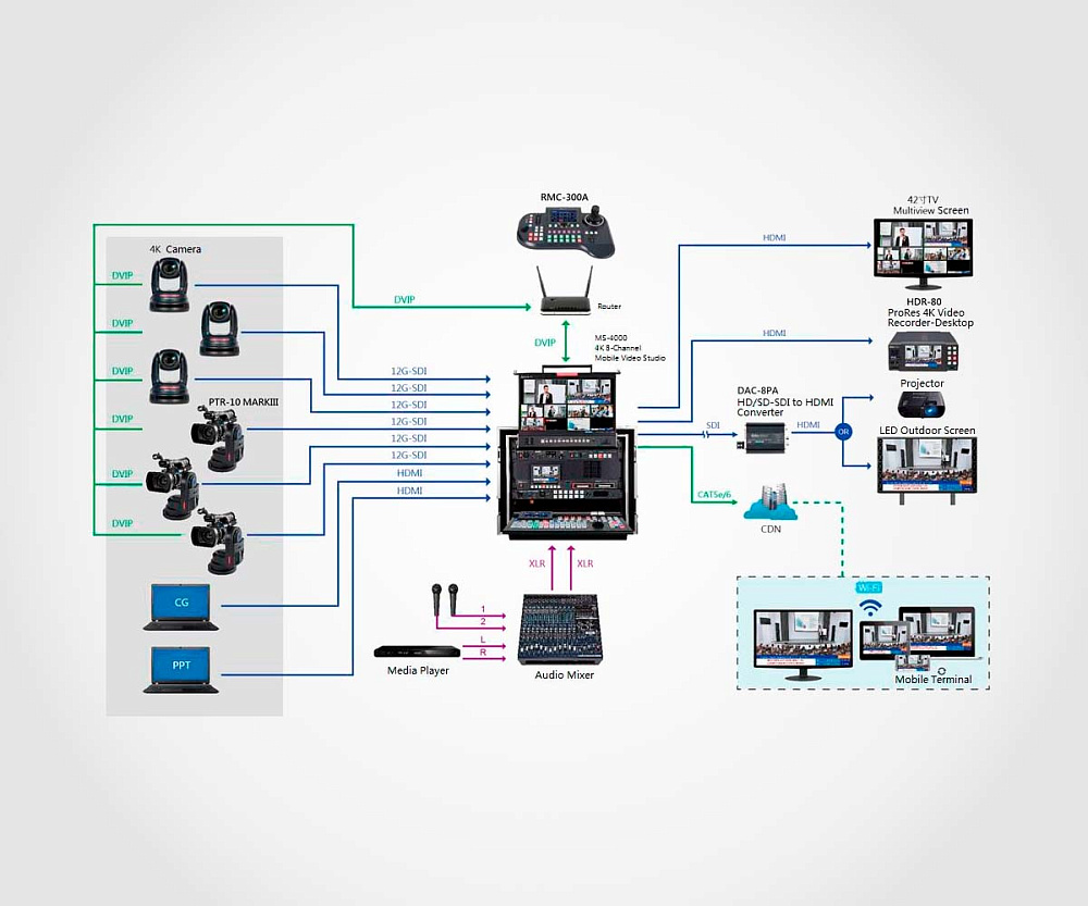 Звук обрабатывается 9‑канальным аудиомикшером AD‑300 с балансными входами XLR, TRS и вложенным аудио из SDI/HDMI** .