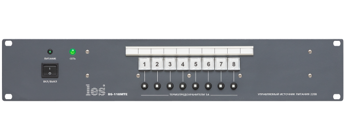 Каждый выход DS-118MTE имеет защиту от перегрузок - автоматический термо-предохранитель на 5А. Предохранители размещены на передней панели устройства. Над предохранителями расположены кнопки ручного включения/выключения напряжения для каждого выхода.