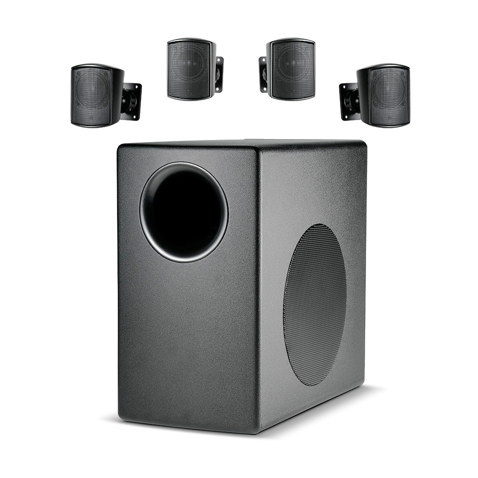 Все компоненты комплекта (и сабвуфер, и сателлиты) поставляются с настенными кронштейнами и имеют элегантный, неброский дизайн, который легко вписывается в любой интерьер. Корпус сабвуфера изготовлен из структурной фанеры, а сателлиты — из высокоударопрочного полистирола, что обеспечивает их долговечность и устойчивость. Защитные оцинкованные металлические решетки надежно предохраняют динамики от повреждений. Возможность наклона сателлитов до 45° позволяет точно направить звук на слушателей.