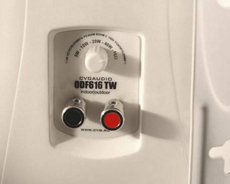 Все акустические системы серии ODF могут работать как в составе 100V трансляционных линий (усилители серий AT, ATP, MA, TR), так и с низкоомными усилителями (серия AI, AL, PA). С обратной стороны корпуса динамика имеется селектор, который позволяет выбрать одну из пяти доступных мощностей в режиме 100V (5/10/20/40W) или перевести акустическую систему в низкоомный режим. В низкоомном режиме ODF616T имеет импеданс - 16ohm.