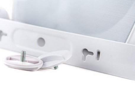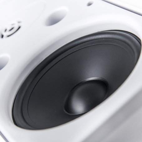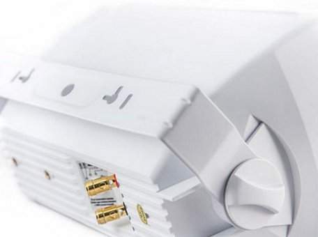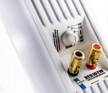 CVGaudio RF616TW – качественные мощные корпусные двухполосные акустические системы для систем трансляции фоновой музыки в торговых и общественных помещениях, таких как рестораны, бары, кафе, магазины молодежной одежды и обуви, учебные классы, конференц залы, фитнес-клубы и так далее. CVGaudio RF616TW имеют современную, оригинальную форму корпуса, изготовленного из белого ABS пластика стойкого к воздействию пыли, влаги и солнечного света. Данную модель рекомендовано использовать только внутри помещений. У RF616TW оригинальное акустическое оформление – на лицевой стороне расположены два фазоинвертора. Это, в купе с качественным мощным 6,5” вуфером (низкочастотным динамиком) из полипропилена с резиновым подвесом и массивной магнитной системой, обеспечивает мощное, очень убедительное звучание низких частот. Большой купольный твитер – высокочастотный динамик, размером 1” изготовлен из шелка и отлично справляется с воспроизведением высоких частот. В результате акустическая система CVGaudio RF616TW звучит очень сбалансировано и комфортно. Лицевая панель динамика скрыта защитной алюминиевой сеткой окрашенной в цвет корпуса. Акустические системы CVGaudio серии RF могут работать как в 100V режиме, так и в низкоомном. Для переключения между режимами (100V - 16ohm) и мощностями в 100V режиме, используется пяти позиционный селектор на задней стороне корпуса акустической системы. В 100V режиме доступны четыре мощности – 6,25/12,5/25/50W , в низкоомном режиме импеданс акустической системы равен 8ohm (мощность RMS - 50W/max-100W). Для подключения приходящих спикерных кабелей в акустических системах CVGaudio RF616TW используется надежные металлические самозажимные клеммные терминалы. Отверстие в кабельном терминале диаметром 5mm позволяет фиксировать два кабеля (приходящий/уходящий) толщиной до 2,5mm. В комплекте с акустической системой RF поставляется металлический кронштейн, окрашенный в цвет корпуса. Он позволяет установить динамик на стену или потолок и поворачивать его в одной (горизонтальной) плоскости. Также возможно использование с акустическими системами серии RF опциональных шарнирных кронштейнов CVGaudio WM-01. Они позволяют поворачивать корпус установленной на стене акустической системы в любой плоскости. Для фиксации кронштейна на корпусе, с задней стороны динамика предусмотрены два крепежных отверстия с резьбой.