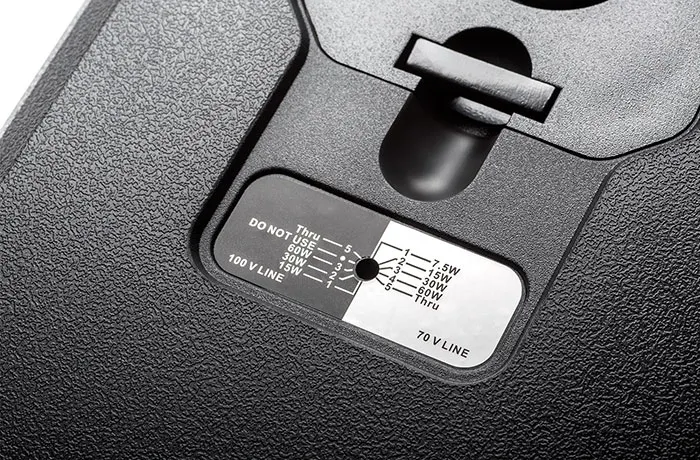 Трансформаторный режим (70/100 В): Встроенный 60-ваттный многоотводной трансформатор позволяет подключать колонку к распределённым линиям громкоговорителей, что идеально подходит для больших объектов. Доступны следующие отводы мощности: