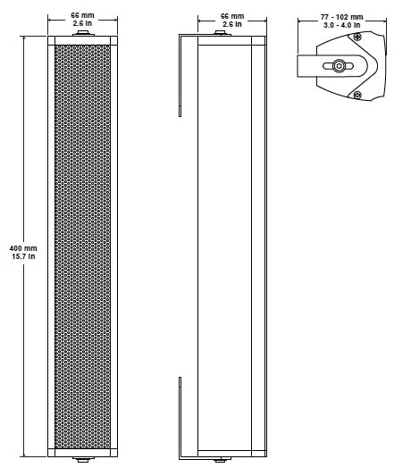 Звуковая колонна BIAMP COLS41 — узкая двухполосная звуковая колонна (4 х 2" НЧ + 1" ВЧ). Мощность 20 Вт RMS (70В/100В/8 Ом). Защита IP66, алюминиевый корпус. Для речевого оповещения в коридорах, лифтовых холлах, на вокзалах. В комплекте настенный кронштейн.