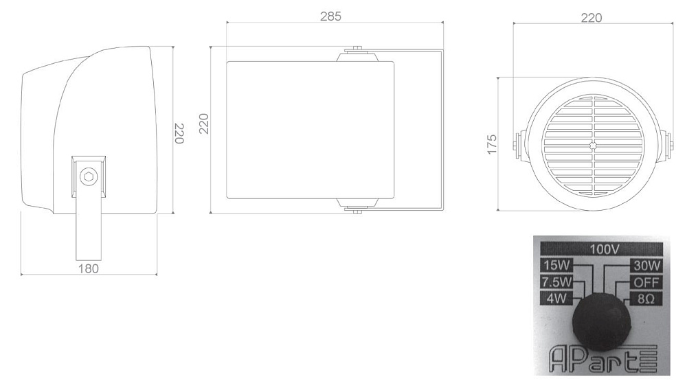 • поворотный переключатель режима работы: 30, 15, 7.5 и 4 Вт и 8 Ом;
