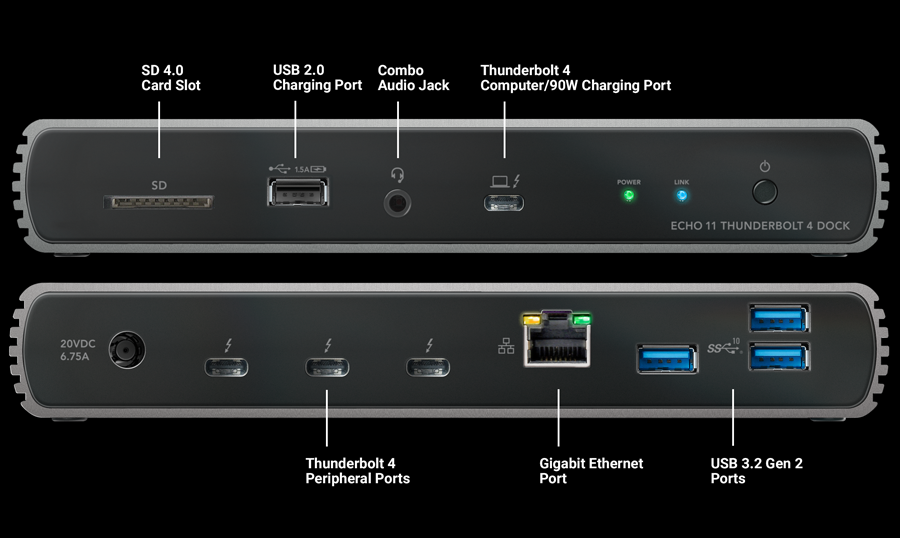 Док-станция Echo 11 обладает четырьмя портами Thunderbolt 4 — один для подключения к компьютеру, плюс три для прямого подключения периферийных устройств Thunderbolt и последовательного подключения до 5 дополнительных устройств на каждый порт. Порты Thunderbolt также совместимы с периферийными устройствами USB4 и USB 3. Для подключенных периферийных устройств, использующих питание от шины, порты Thunderbolt док-станции обеспечивают 15 Вт на порт, поддерживая даже самые требовательные периферийные устройства Thunderbolt и USB с питанием от шины.