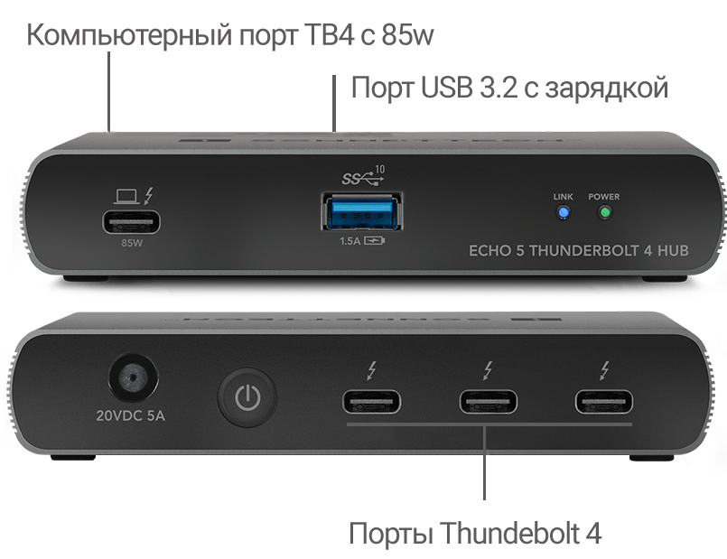 Хаб Echo 5 Thunderbolt оснащен четырьмя портами Thunderbolt 4 (обратно совместим с Thunderbolt 3): один для подключения / питания компьютера, плюс три для подключения периферийных устройств Thunderbolt (и подключения по цепочке до 5 устройств). Порты Thunderbolt также поддерживают периферийные устройства USB4 и USB 3. Для устройств с питанием от шины периферийные порты Thunderbolt хаба обеспечивают 15Вт на порт, поддерживая самые требовательные периферийные устройства Thunderbolt и USB с питанием от шины — они даже могут заряжать ваш iPhone или iPad в два раза быстрее, чем при использовании порта USB Type A.