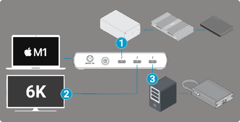 - Порт 3: настольная Thunderbolt RAID СХД + сетевой адаптер Sonnet Solo10G 10GbE
