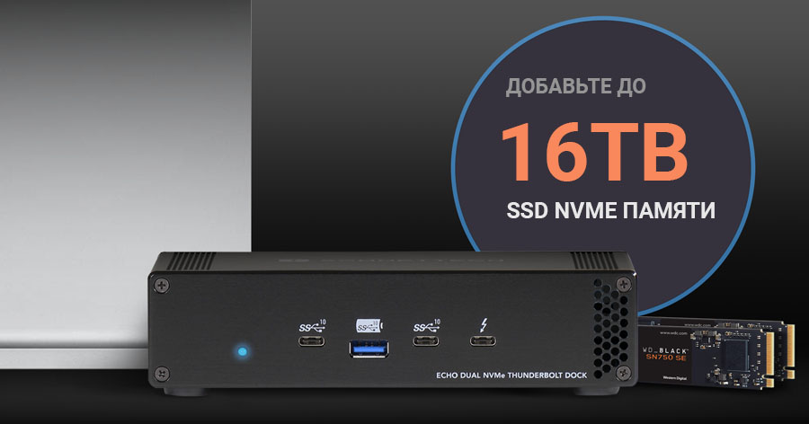 Док-станция Echo Dual NVMe Thunderbolt оснащена двумя слотами для установки SSD-накопителей M.2 NVMe PCIe, что позволяет легко устанавливать внутрь высокопроизводительные накопители M.2 NVMe (продаются отдельно). Поскольку установленные накопители взаимодействуют с контроллером Thunderbolt док-станции, они используют его пропускную способность для обеспечения производительности.
