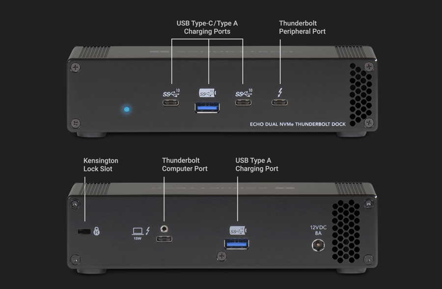 Док-станция Echo Dual NVMe Thunderbolt оснащена четырьмя универсальными портами USB 3.2 Gen 2 (10 Гбит/с) (два Type-C и два Type-A), которые поддерживают сверхбыстрые SSD-накопители USB NVMe на полной скорости. Каждый порт обеспечивает мощность до 7,5 Вт для обеспечения бесперебойной работы подключенных устройств, которым требуется питание от шины, а также может использоваться для зарядки iPhone, iPad или другого устройства, которое заряжается через USB.