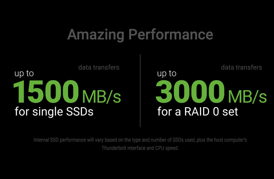 Каждый из отдельных SSD-накопителей, установленных в док-станции Echo Dual NVMe, может обеспечивать устойчивую передачу данных со скоростью до 1500 МБ/с. Сконфигурированный как RAID 0 для еще большей производительности возможна передача данных со скоростью до 3000 МБ/с. Начните с одного SSD и добавьте SSD любого объема позже, не форматируя первый.