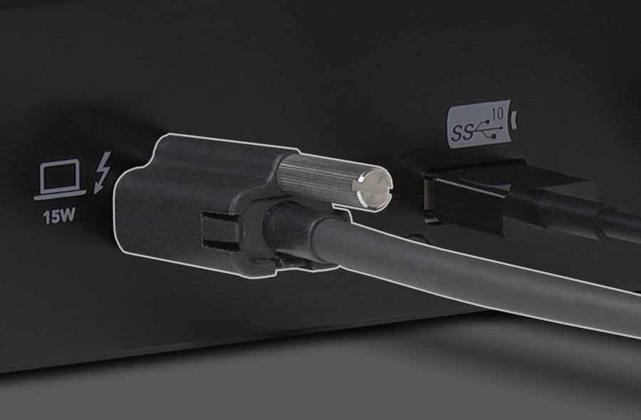 В комплекте поставки идет кабель Thunderbolt, который поддерживает полную пропускную способность Thunderbolt 40 Гбит/с и совместим с компьютерами Thunderbolt 4 и Thunderbolt 3. Также в комплекте присутствует фиксатор разъема ThunderLok 3, который предотвращает случайное отсоединение кабеля — просто наденьте его на один конец кабеля, а затем подключите разъем и закрепите фиксатор на док-станции, повернув винт.
