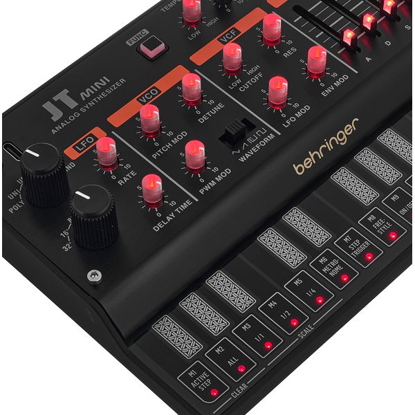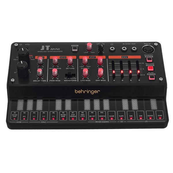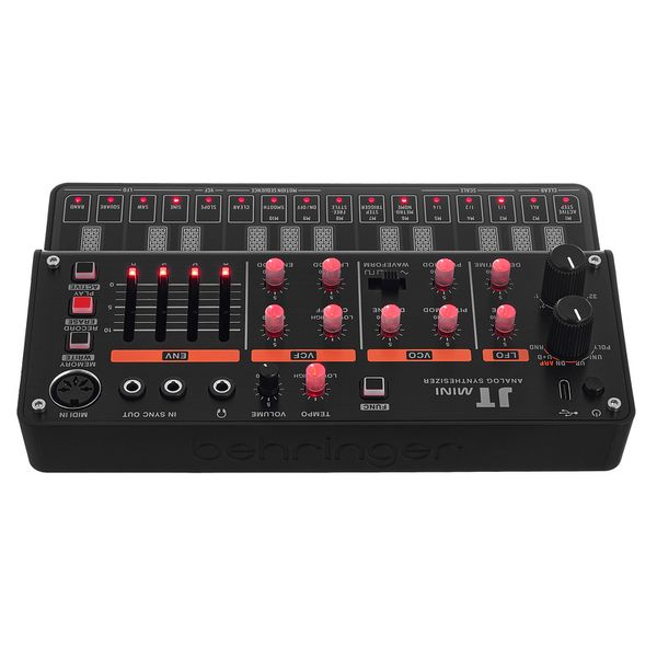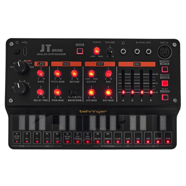 Интеграция с вашим основным оборудованием также продумана до мелочей. На борту есть полноценный 5-пиновый MIDI-вход для подключения внешних клавиатур или секвенсоров. А через USB-C передается не только питание, но и MIDI, что делает JT Mini идеальным спутником для домашней студии и работы в DAW. Более того, наличие входов/выходов синхронизации (Sync) позволяет соединить его с другими устройствами (например, с драм-машинами Behringer RD или синтезаторами серии TD) без использования компьютера.