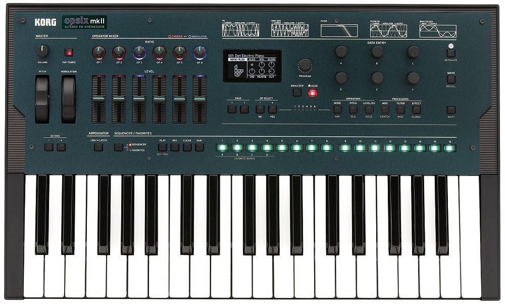 Синтезатор KORG OPSIX MKII — цифровой FM-синтезатор. 37 клавиш, полифония 64 голоса. Упрощённый микшер Operator, архитектура «шесть в одном», 16-шаговый секвенсор, матрица модуляции.