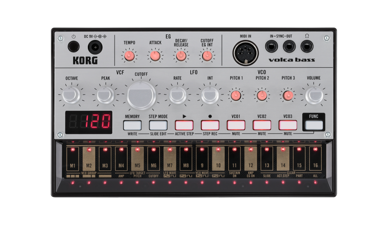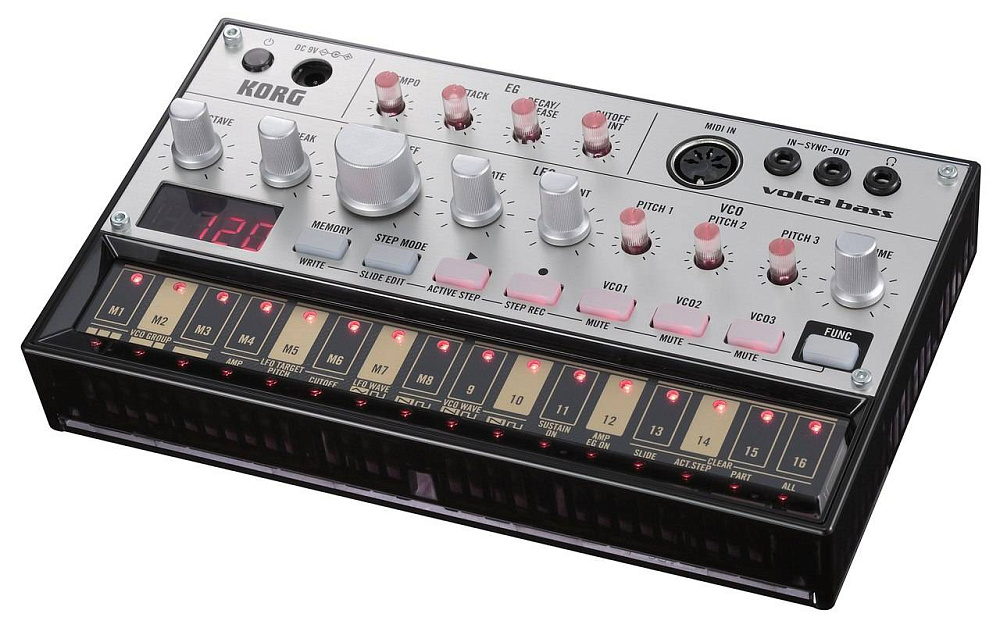 Синтезатор KORG Volca Bass — аналоговая бас-машина. 3 осциллятора, аналоговый фильтр, 16-шаговый секвенсор с функцией Slide. Синхронизация по Sync/MIDI, питание от батареек. Для создания басовых линий в стилях acid house, электронная музыка.