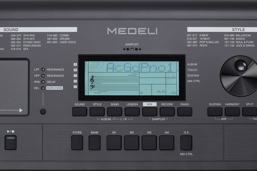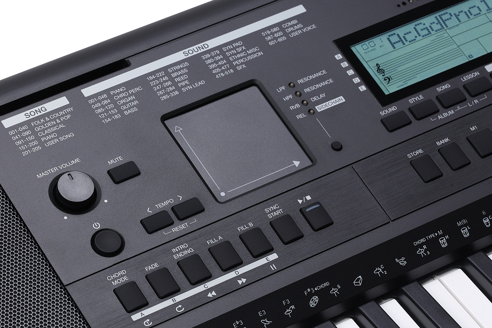 | Управление стилем / ритмом | старт/стоп, синхро-старт, вступление / концовка, вариации A / B, заполнения A / B, аккорд вкл. / выкл. есть, режим "Авто", нарастание / затухание. |